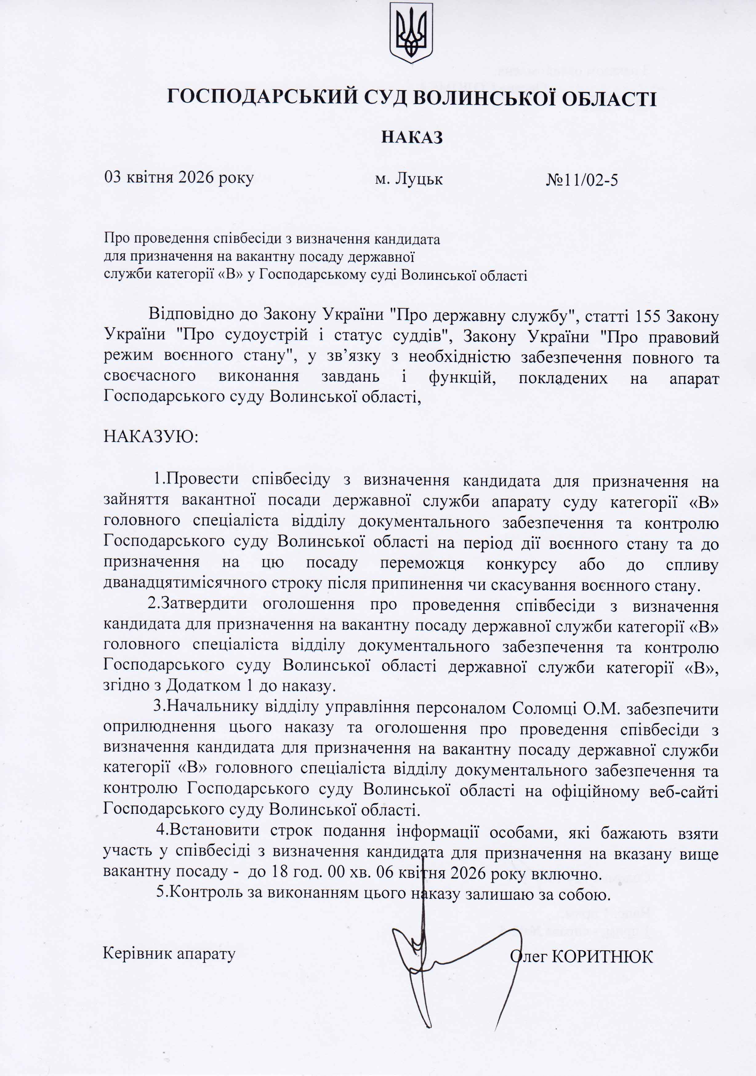 Відповідно до наказу керівника апарату суду від 03.04.2026 №11/02-5 у Господарському суді Волинської області буде проведена співбесіда з визначення кандидата для призначення на вакантну посаду державної служби категорій «В» - головного спеціаліста відділу документального забезпечення та контролю – одна посада, строково.