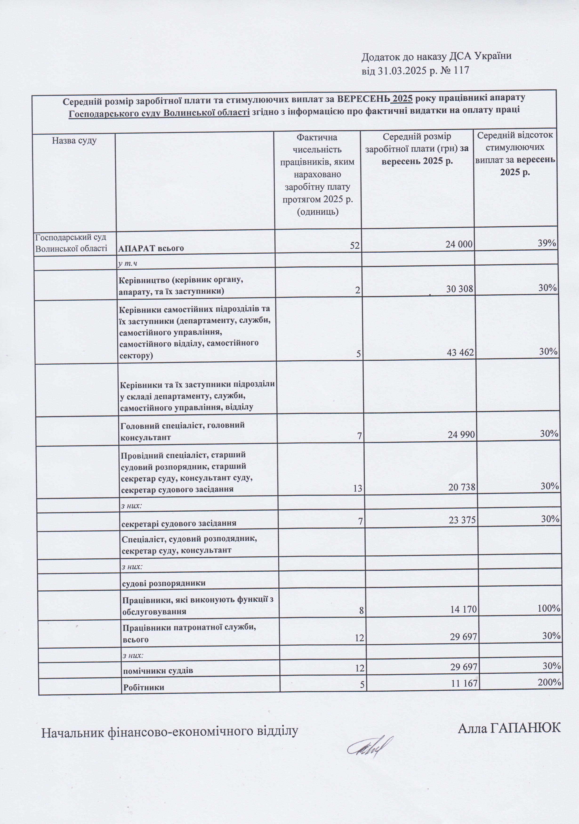 Iнформація про середній розмір заробітної плати та стимулюючих виплат працівників апарату Господарського суду Волинської областіна підставі звітності про фактичні видатки на оплату праці наведена в додатку.