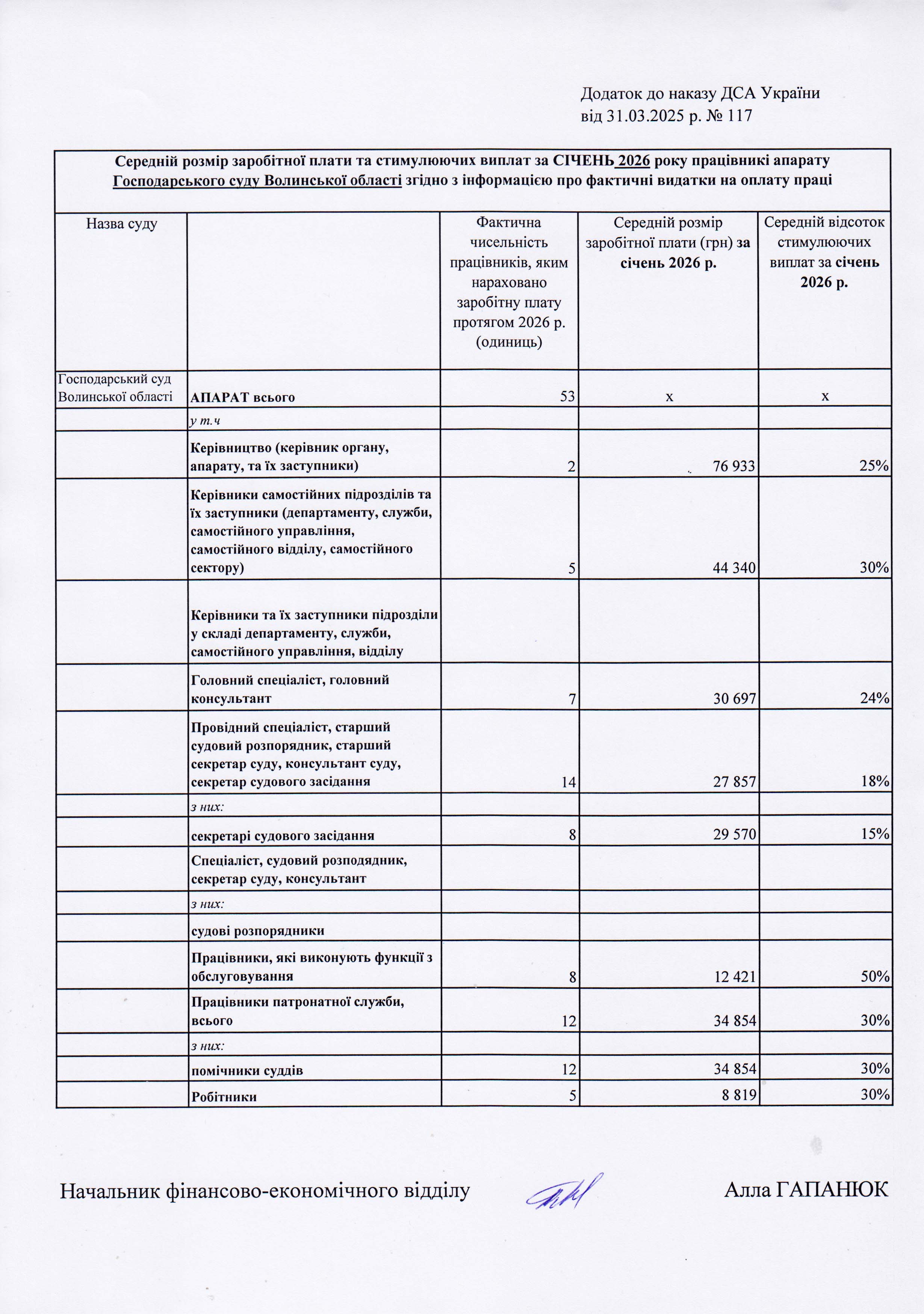 Iнформація про середній розмір заробітної плати та стимулюючих виплат працівників апарату Господарського суду Волинської областіна підставі звітності про фактичні видатки на оплату праці наведена в додатку.